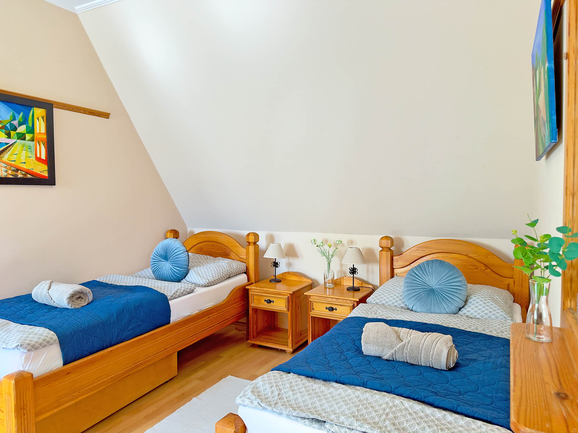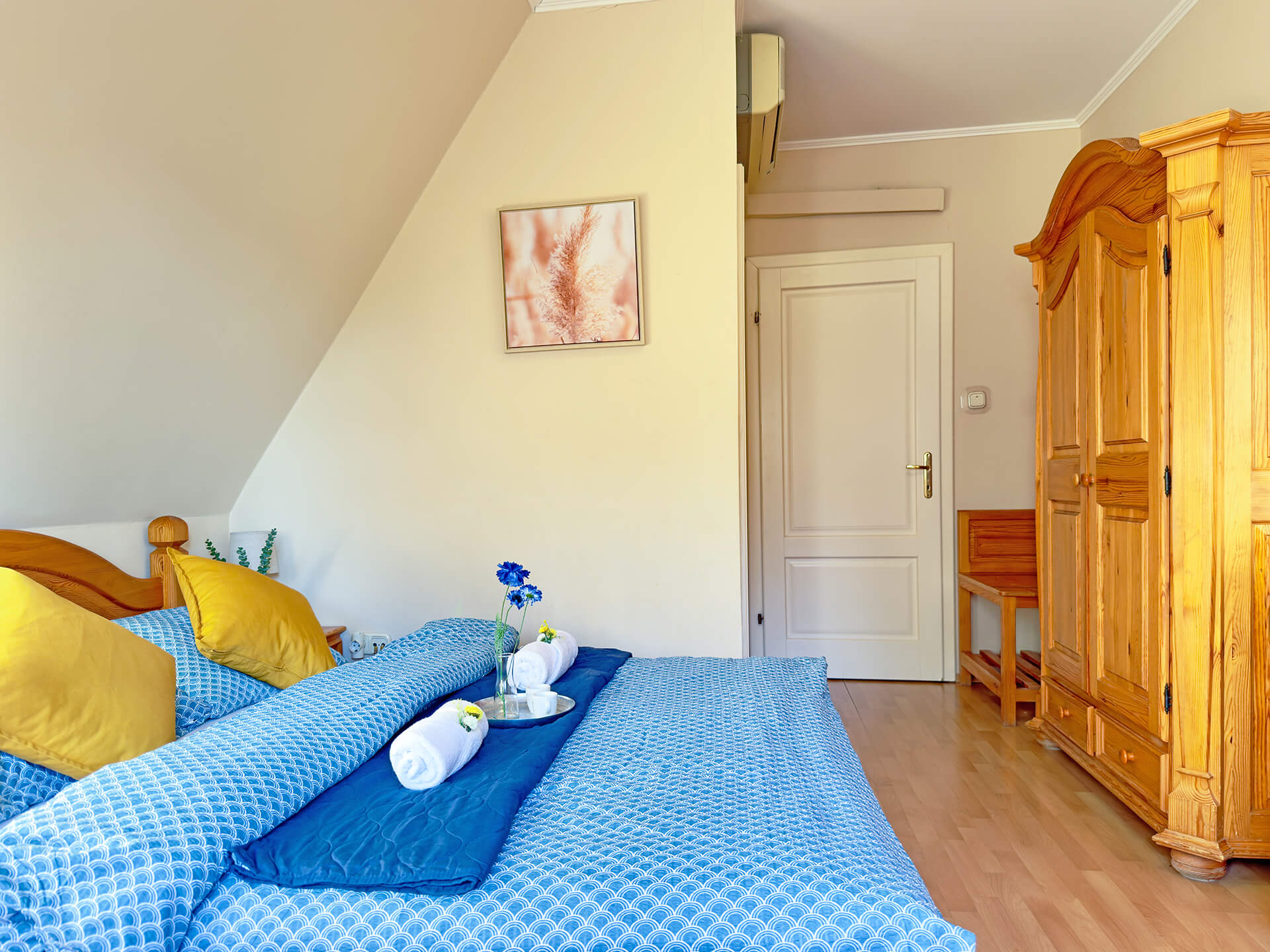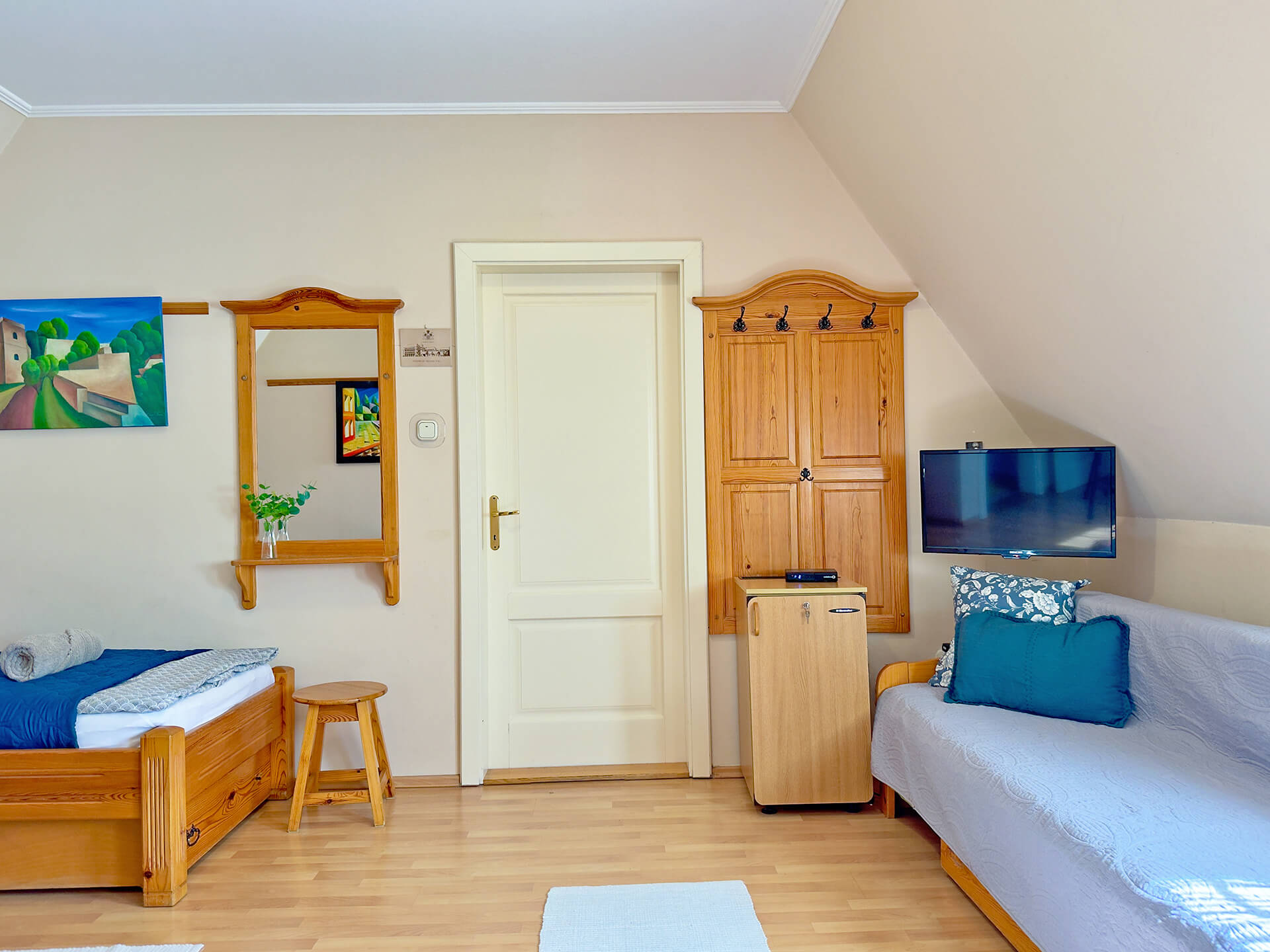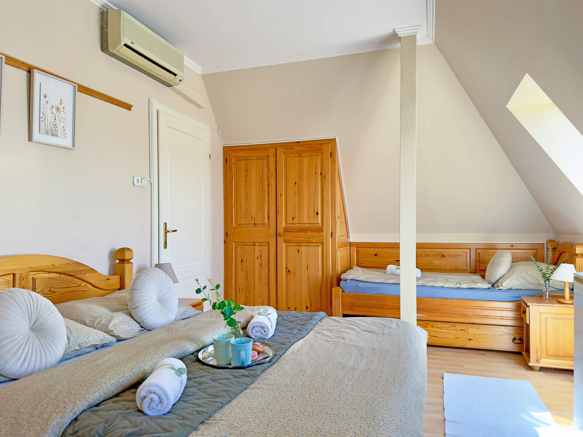 - Háromfős Elrendezés: A szobában egy kényelmes franciaágy (2 fő részére) és egy egyszemélyes ágy található, így biztosítva a pihentető alvást mindhárom vendég számára.