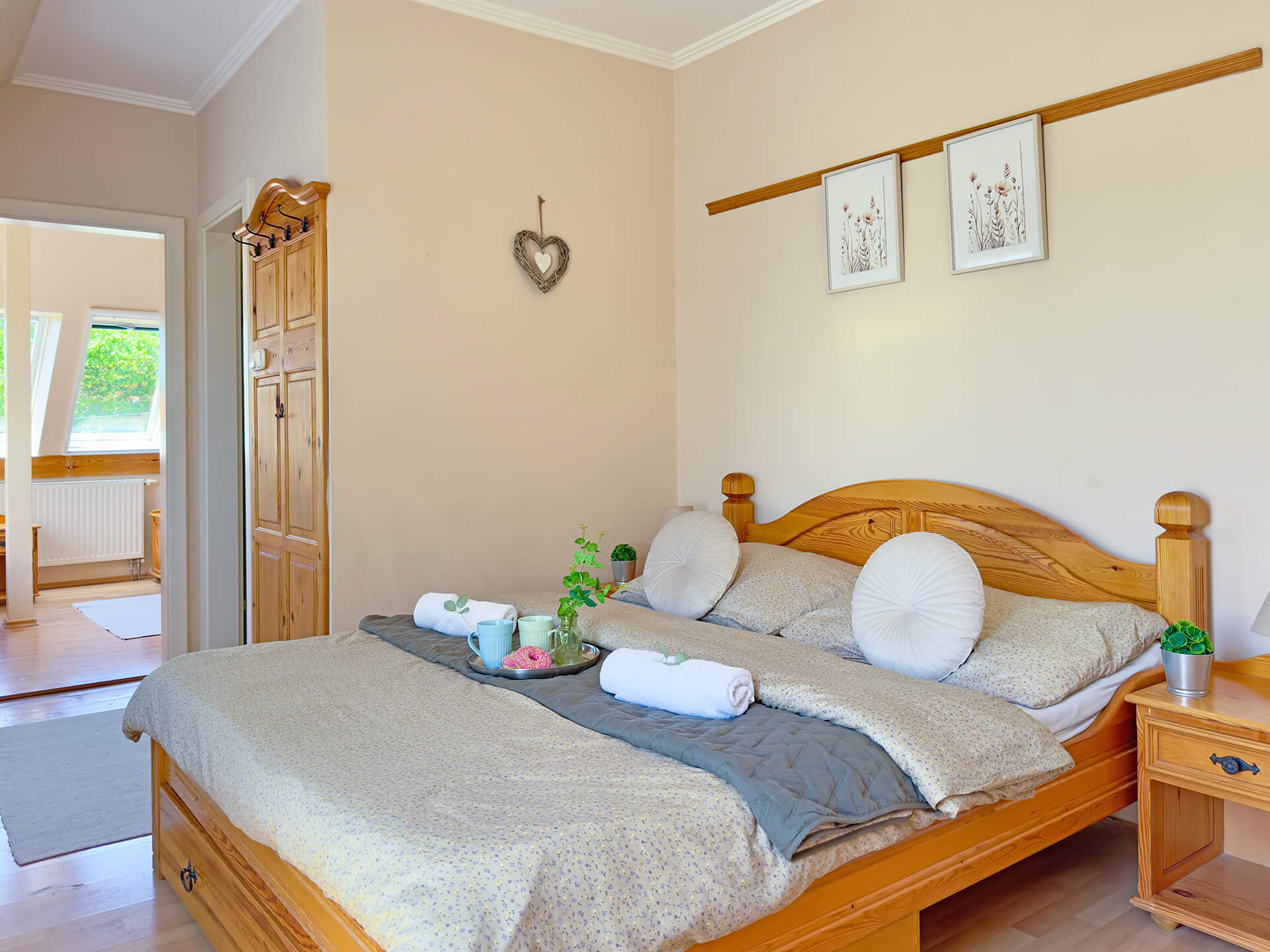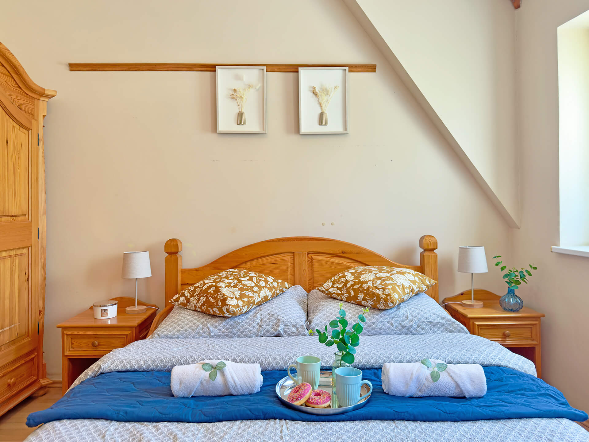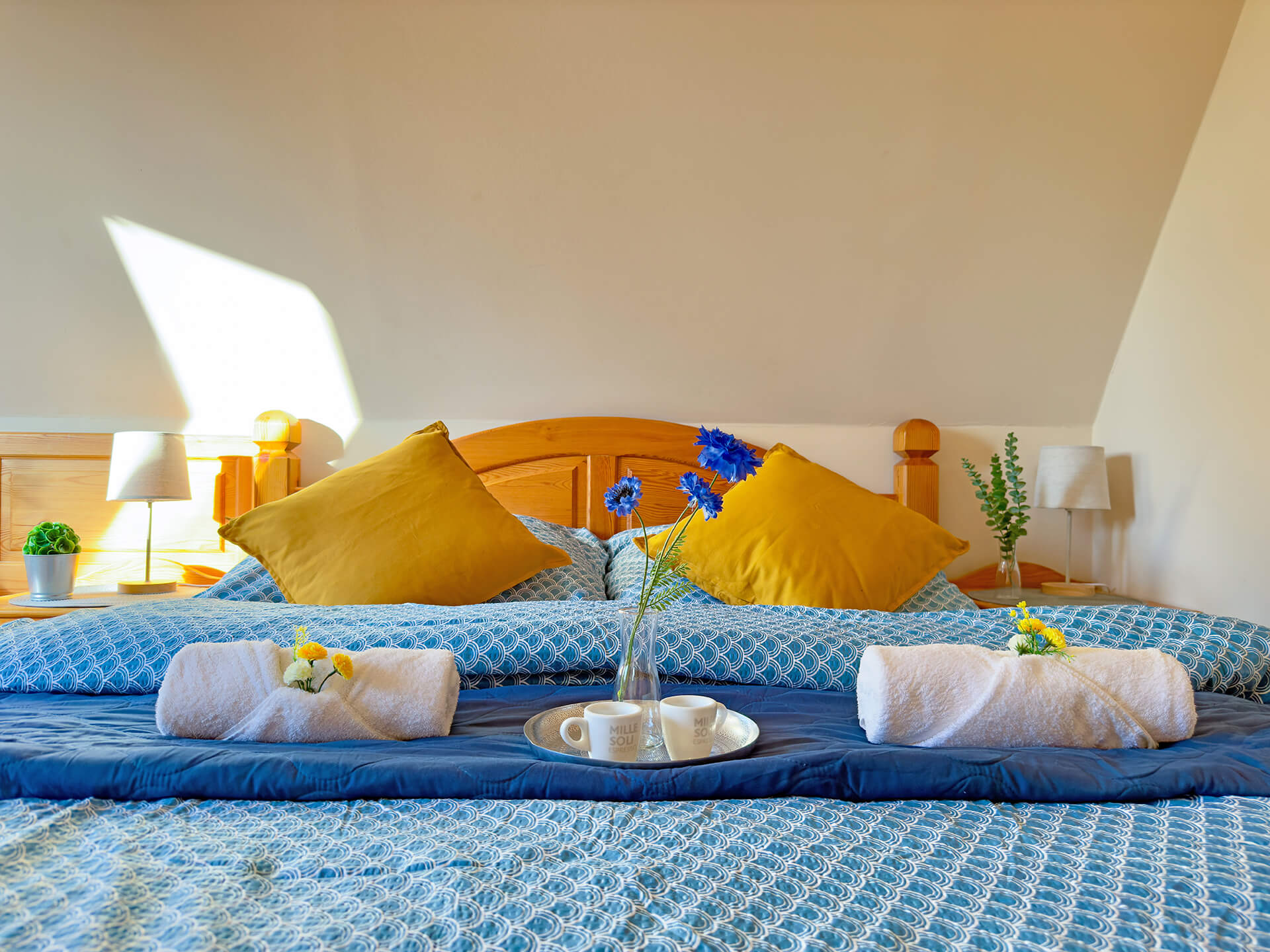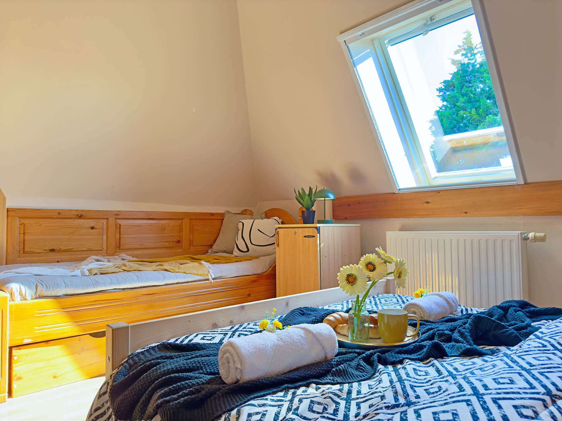 - Háromfős Elrendezés: A szobában egy kényelmes franciaágy (2 fő részére) és egy egyszemélyes ágy található, így biztosítva a pihentető alvást mindhárom vendég számára.