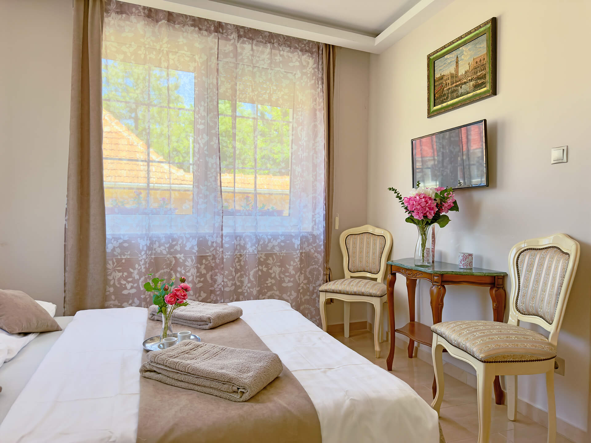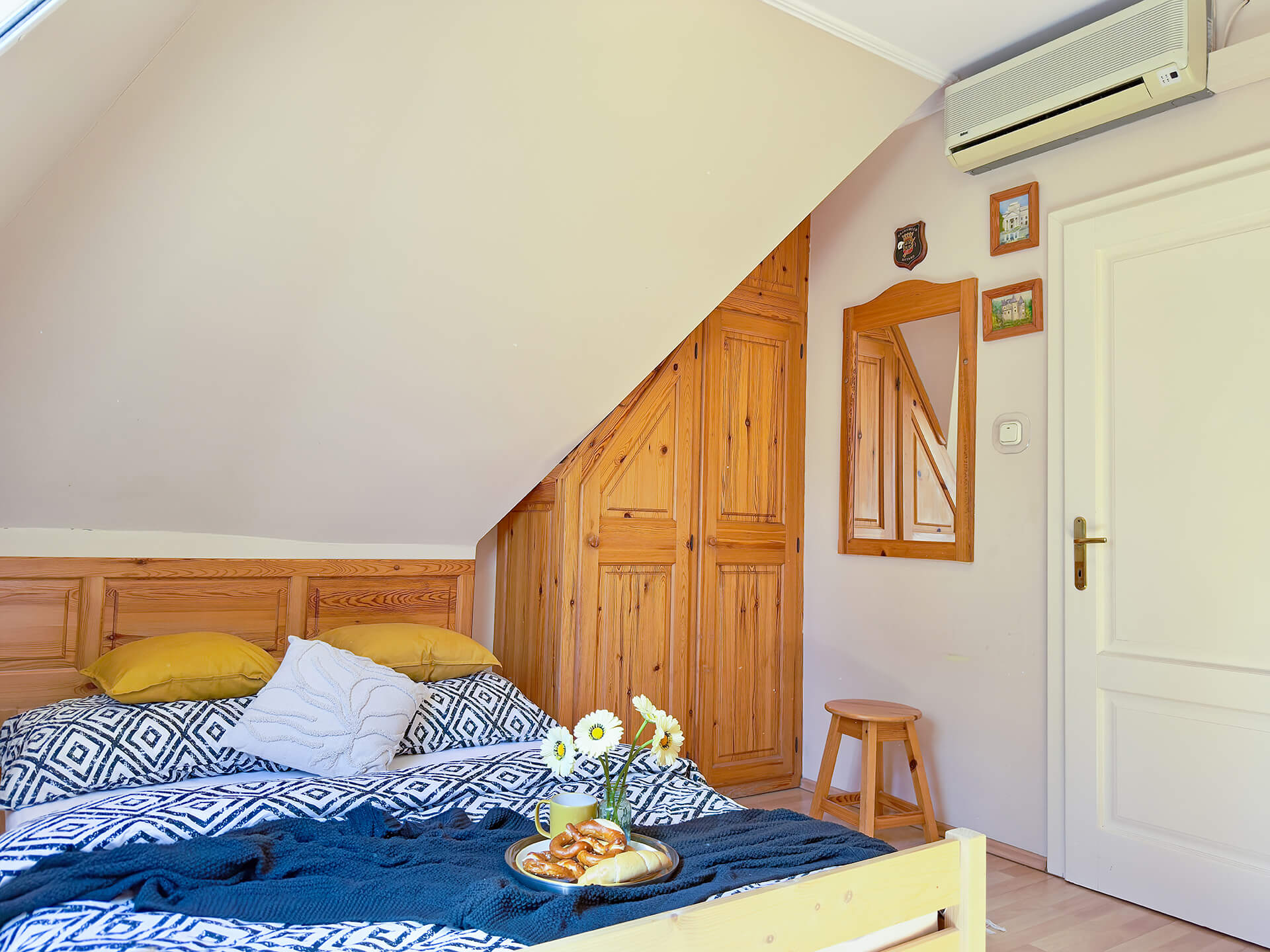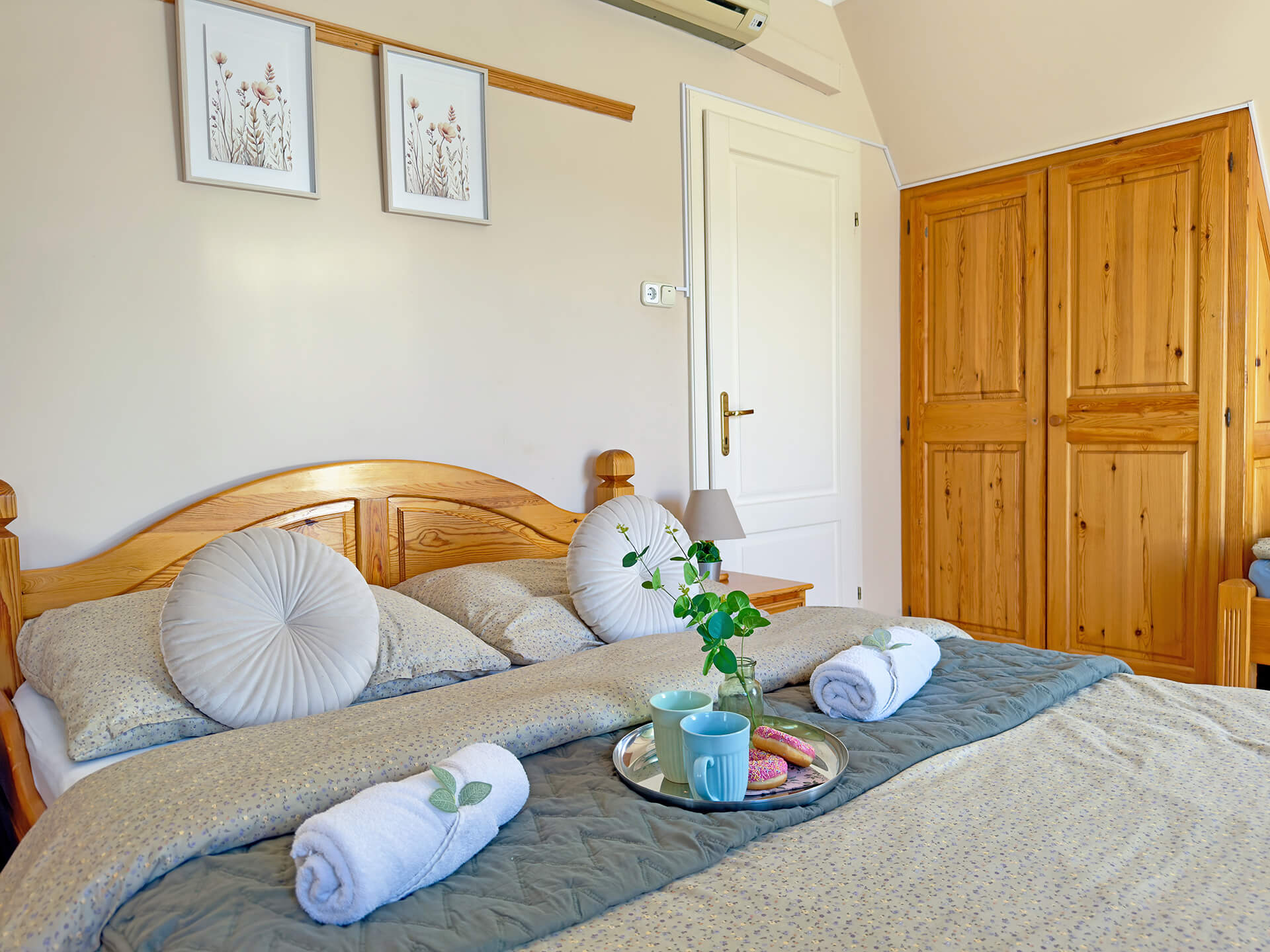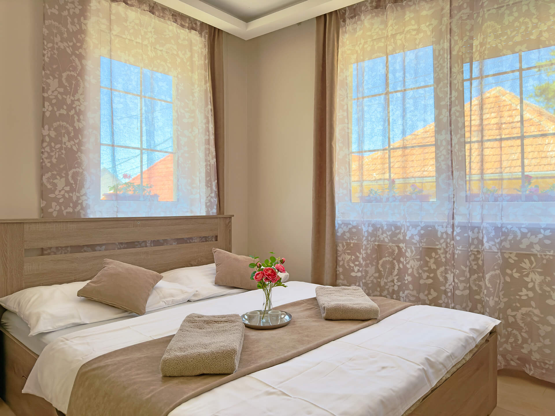 - Franciaágyas elrendezés: A szoba egy kényelmes franciaággyal gondoskodik a pihentető alvásról.
