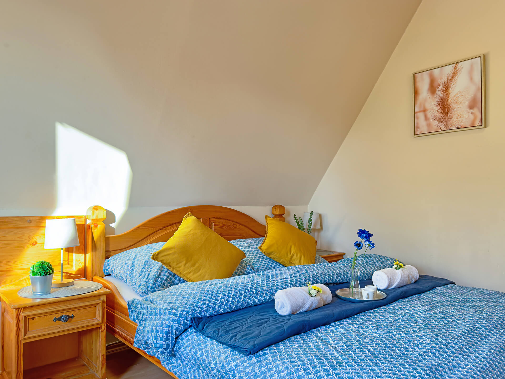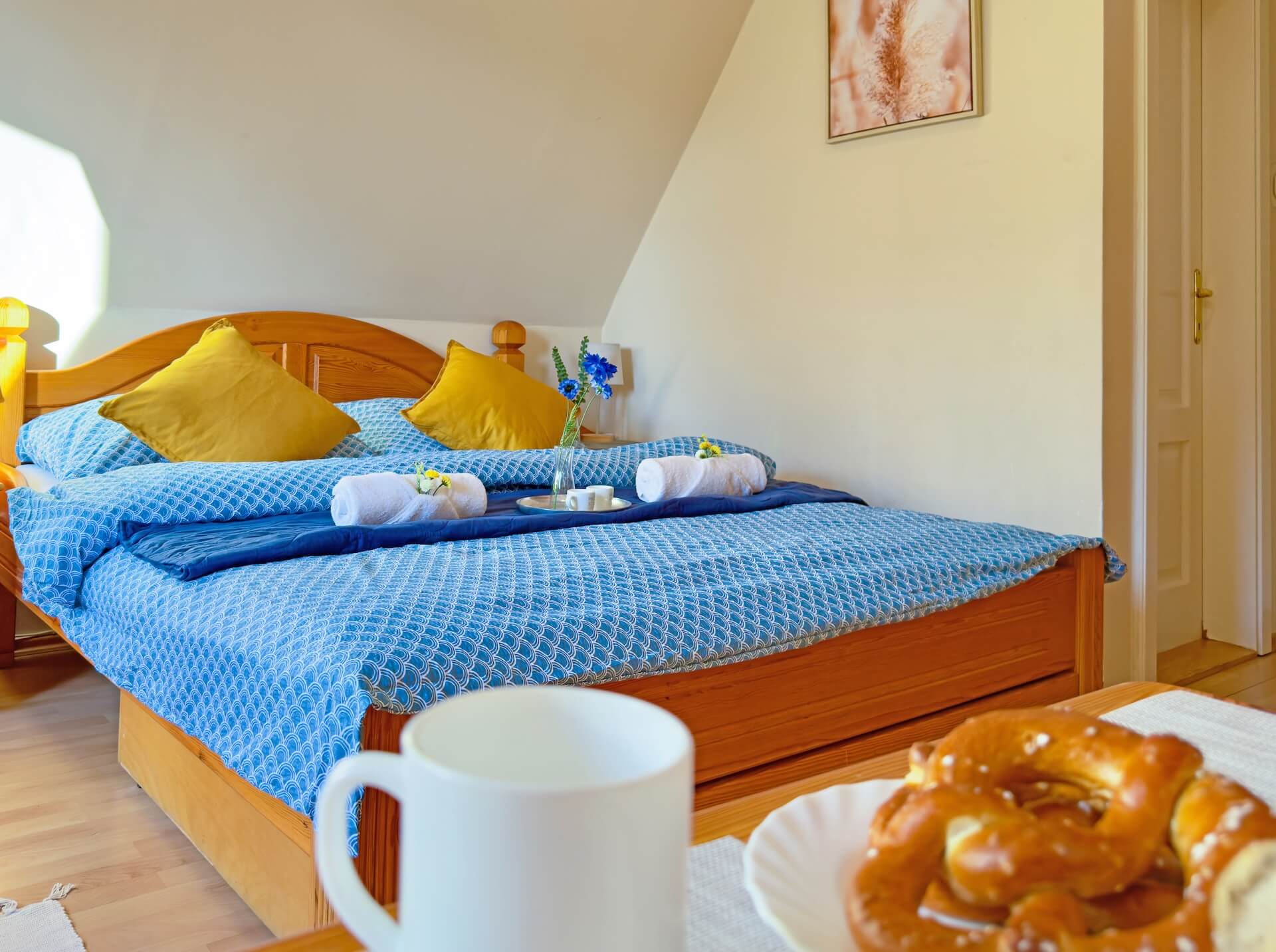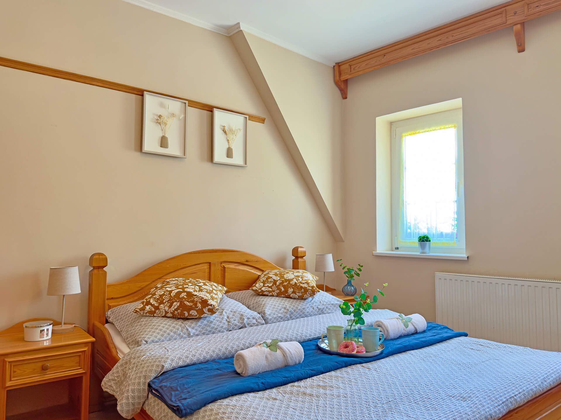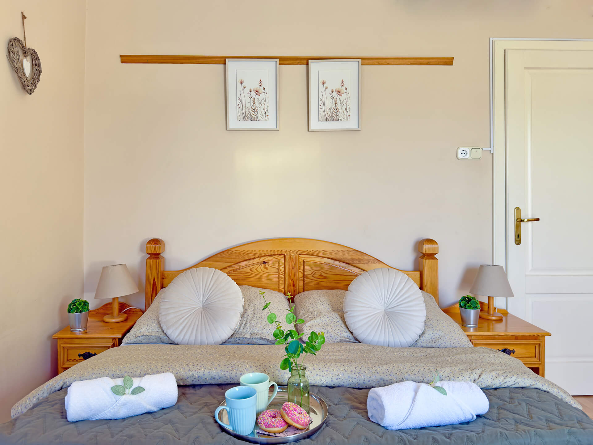 - Franciaágyas elrendezés: A szoba egy kényelmes franciaággyal gondoskodik a pihentető alvásról.