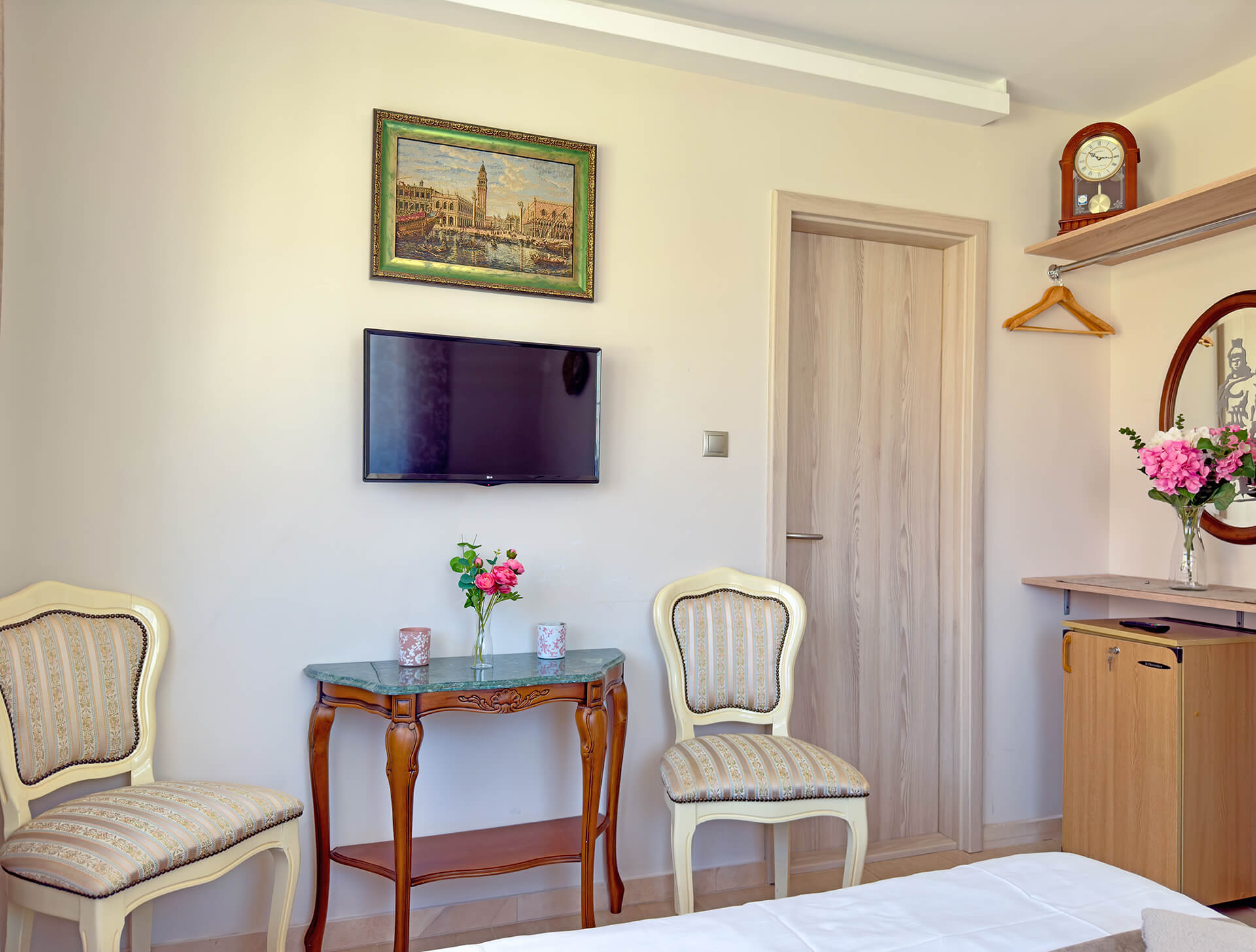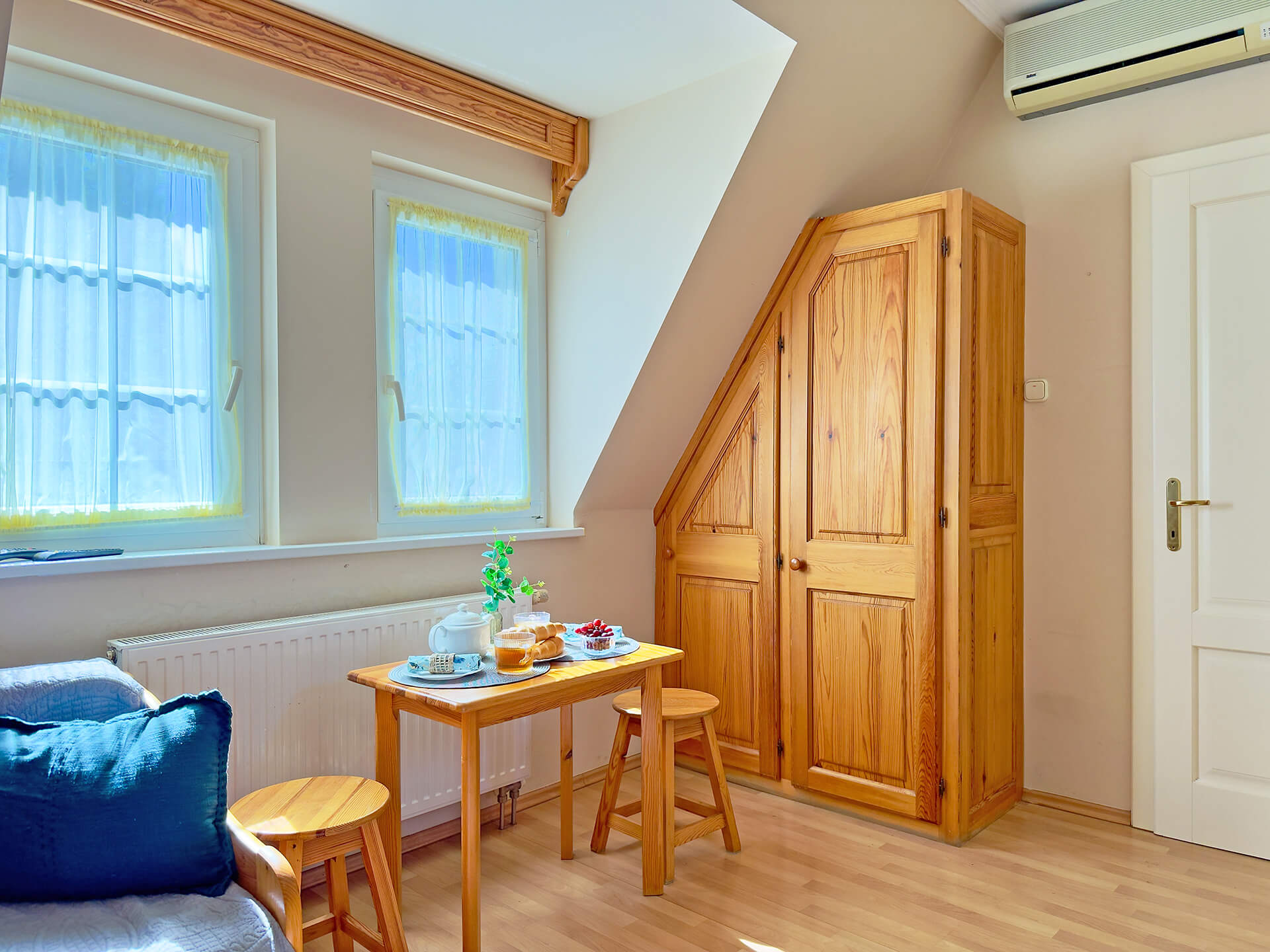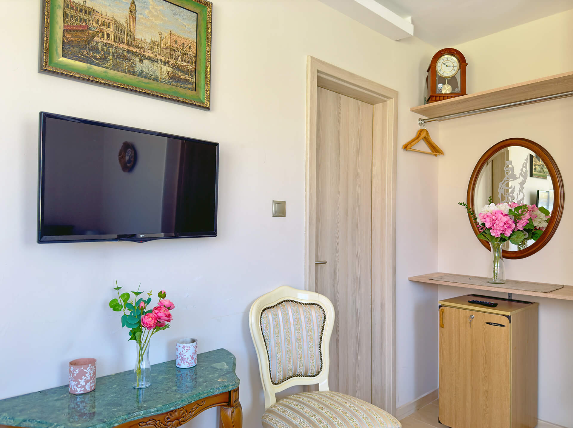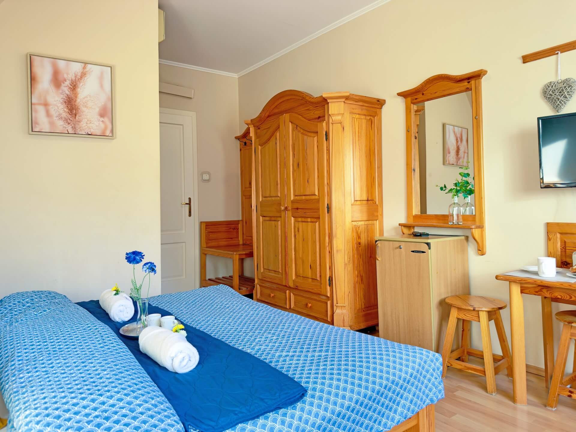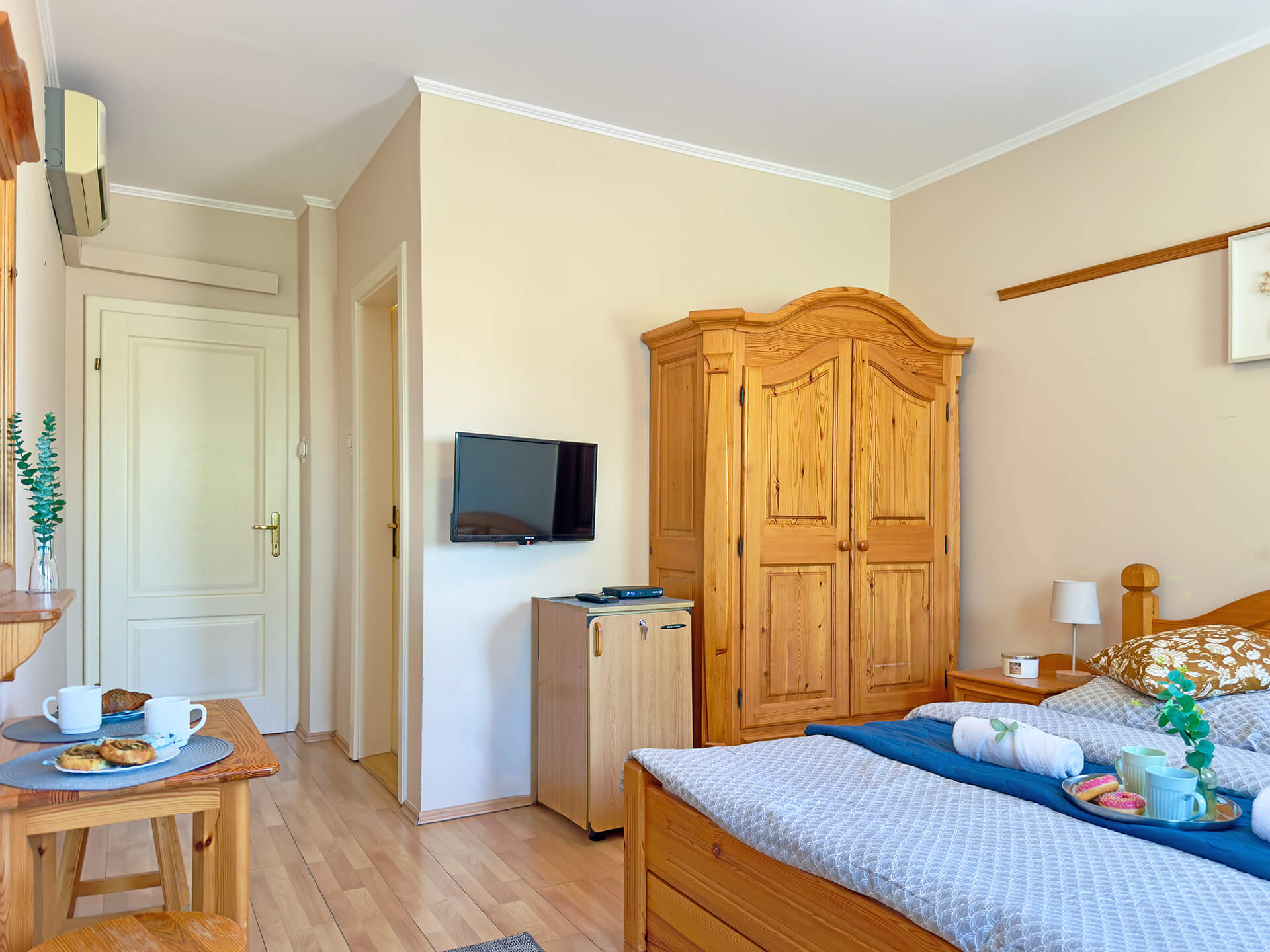 - Modern Felszereltség: A szoba beépített szekrénnyel, minihűtővel, TV-vel és klímával is felszerelt, garantálva a kellemes hőmérsékletet és a komfortos kikapcsolódást.