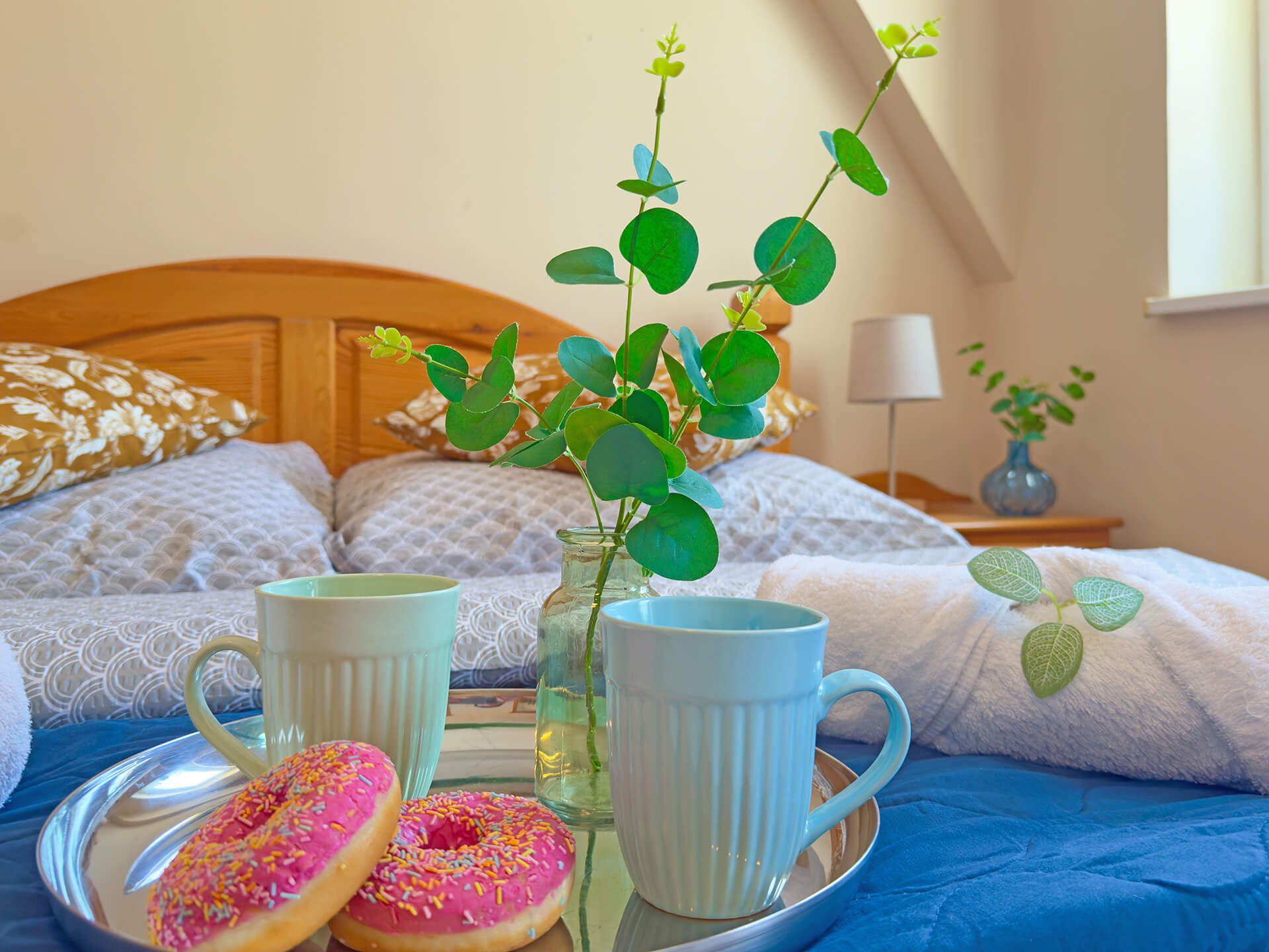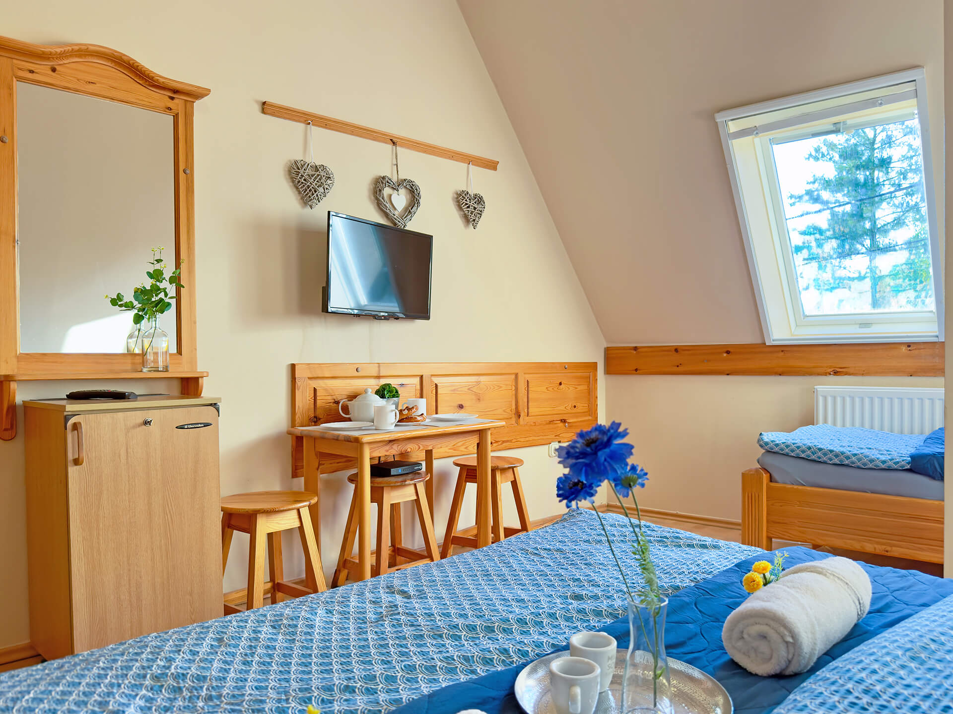 - Modern Felszereltség: A pihenést beépített szekrény, minihűtő, televízió és klímaberendezés teszi teljessé, biztosítva a komfortos hőmérsékletet.