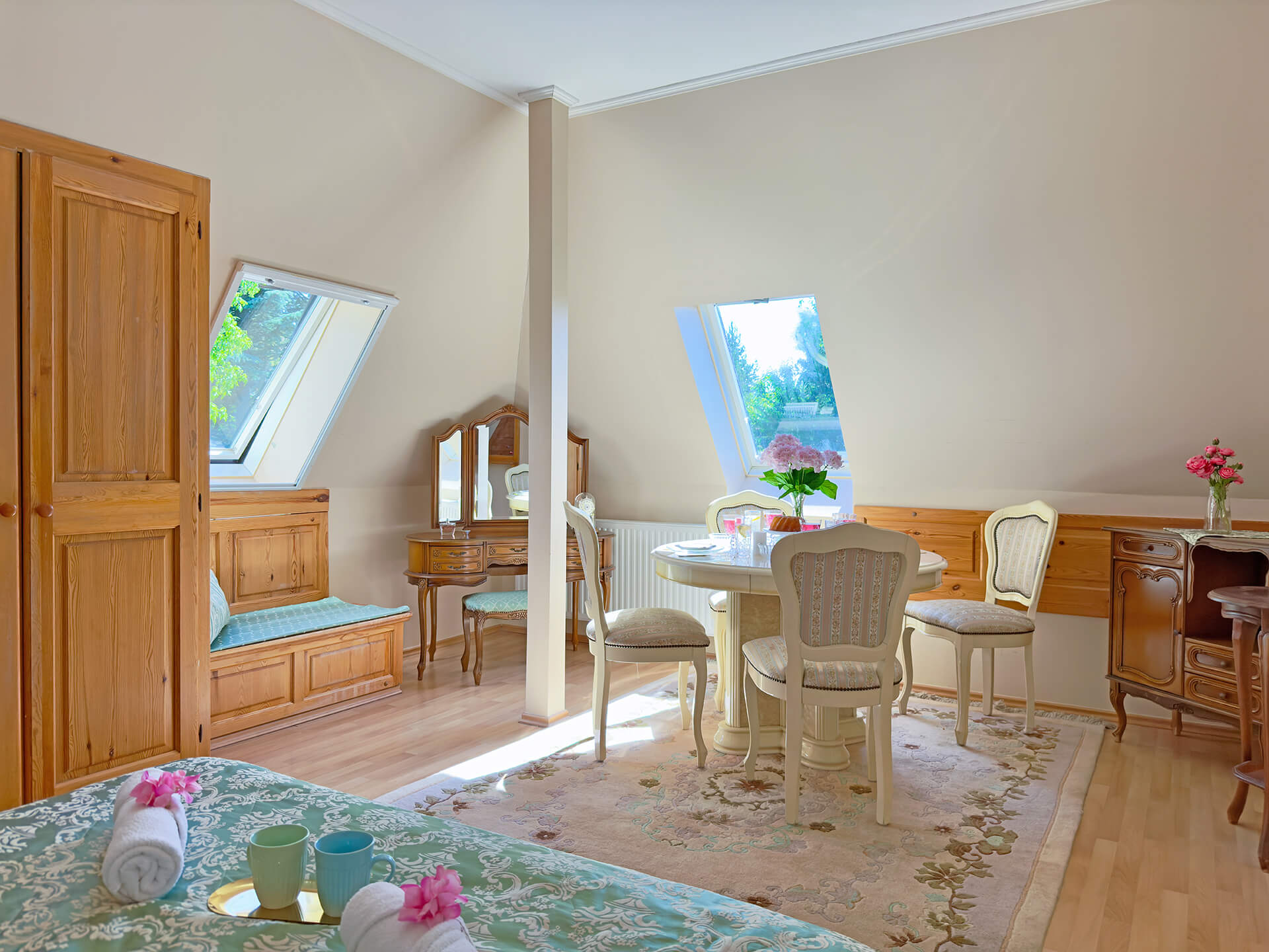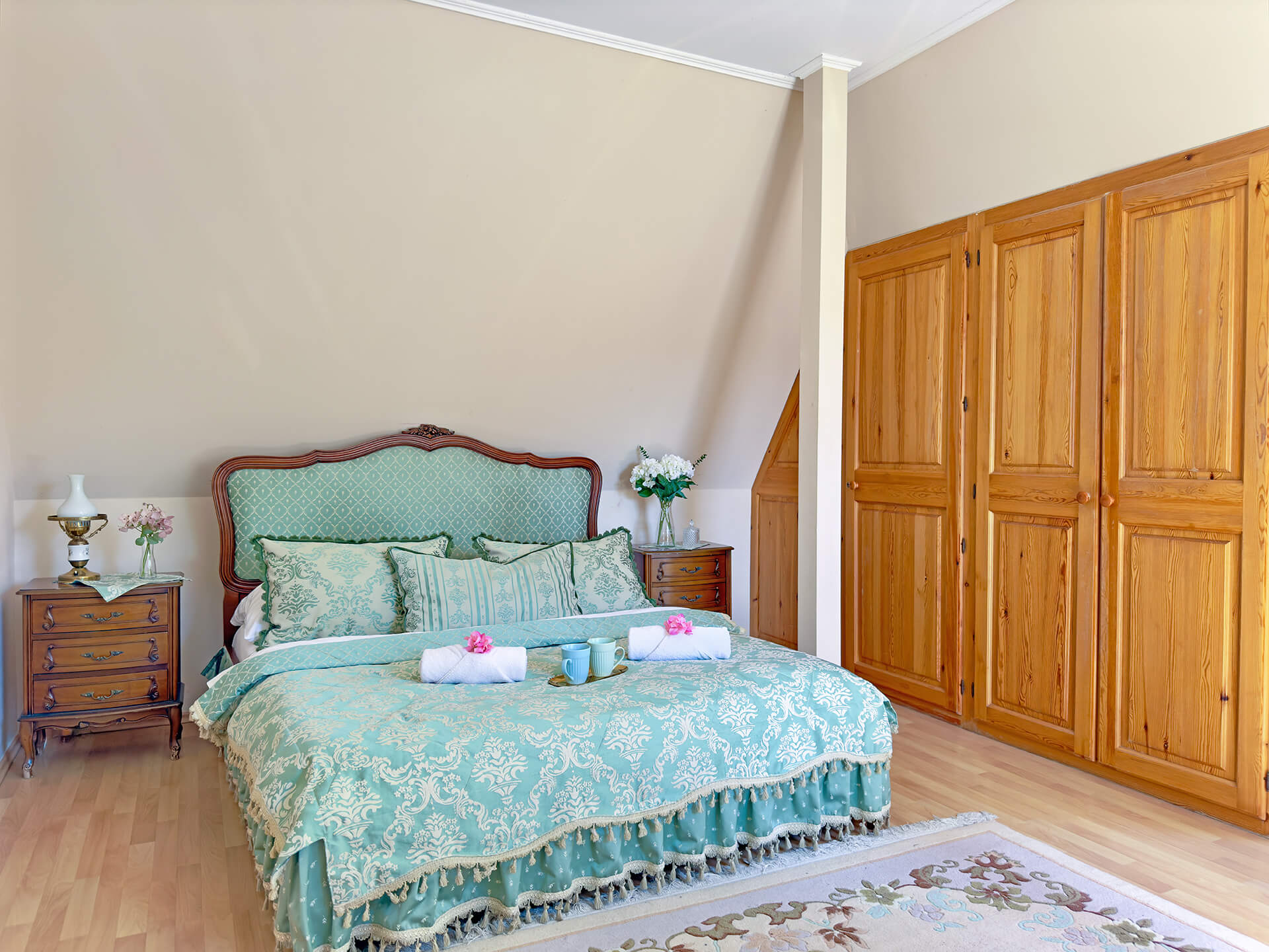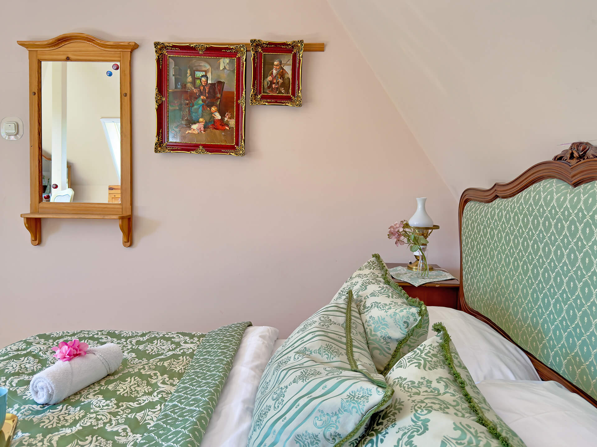 - Elegáns Barokk Stílusú Hálószoba: A belső szobában egy franciaágy és egy nagyméretű, barokk stílusú asztal székekkel várja vendégeinket, beépített szekrénnyel kiegészítve. Ez a tér különleges hangulatot áraszt, tökéletes a pihenéshez és a beszélgetésekhez.