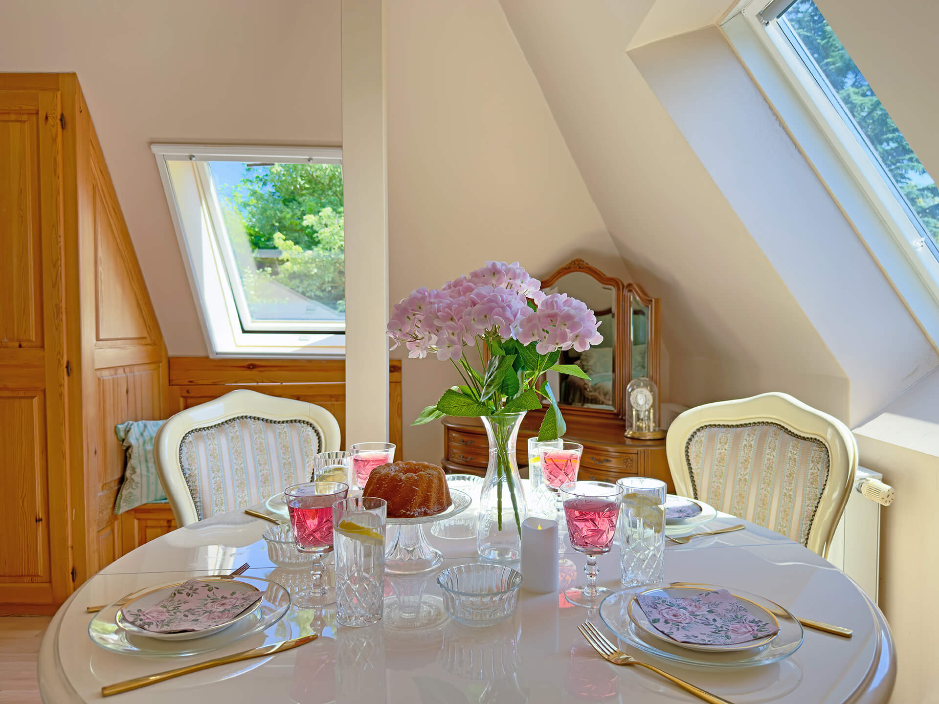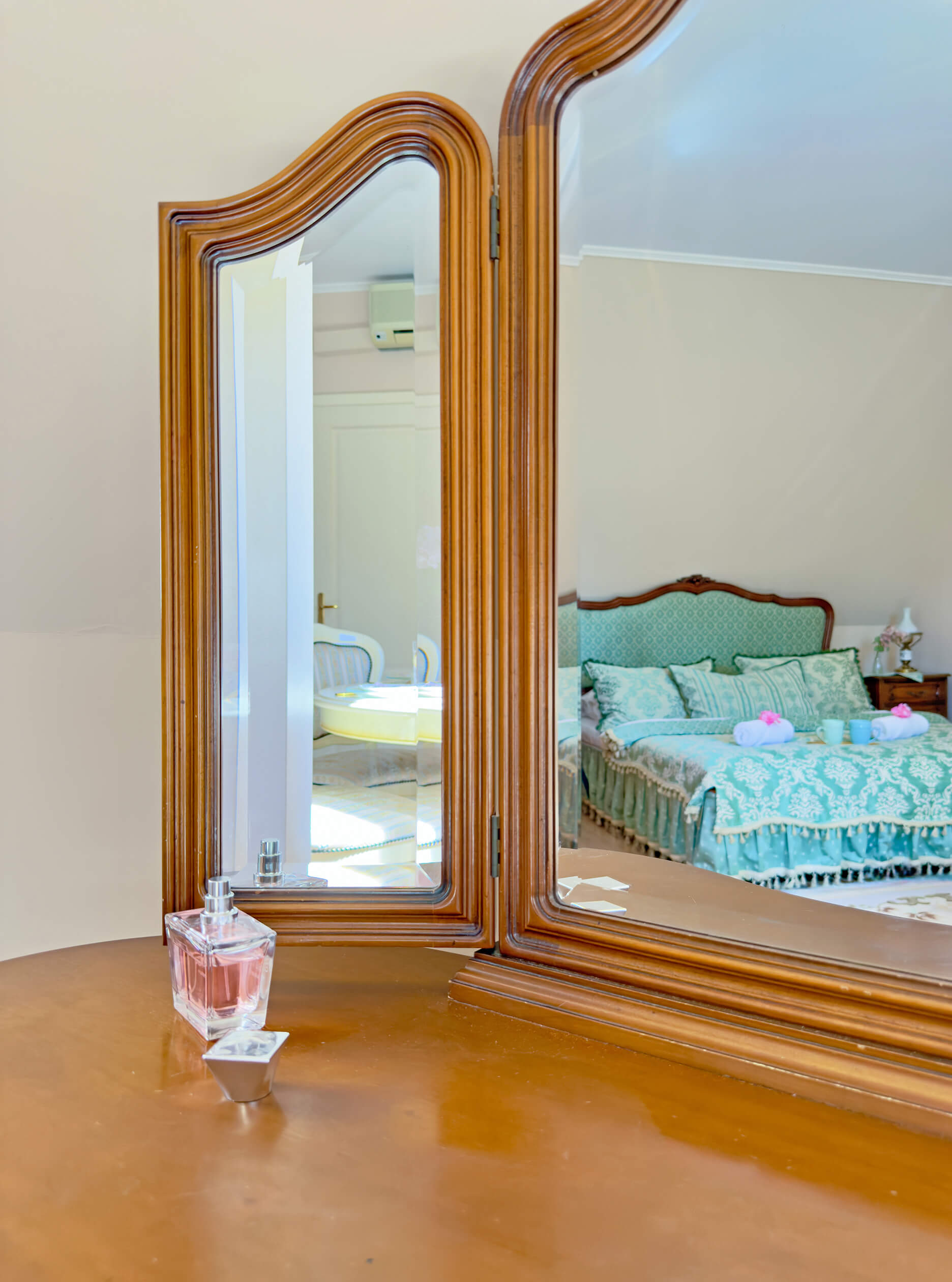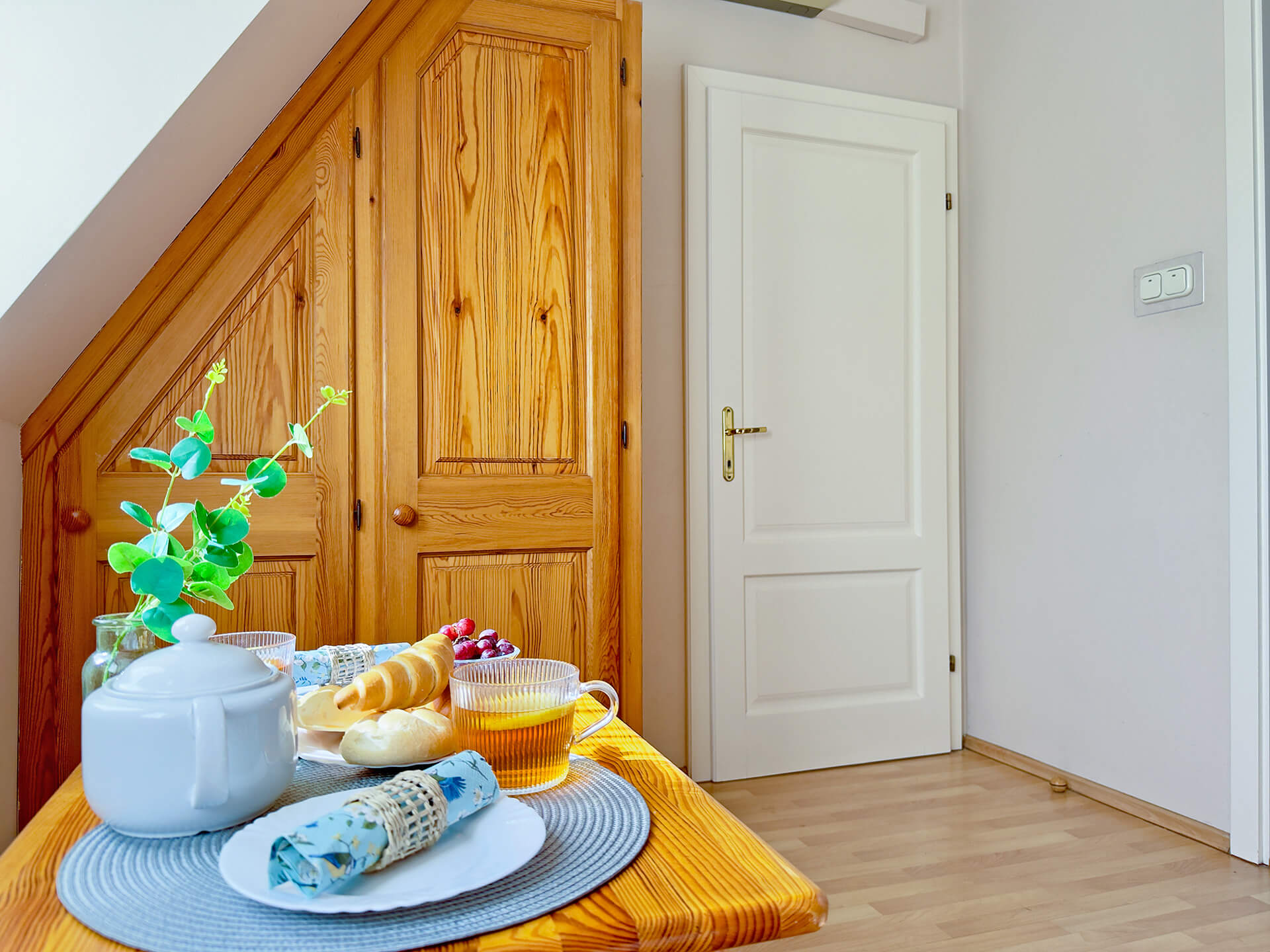 - Elegáns Barokk Stílusú Hálószoba: A belső szobában egy franciaágy és egy nagyméretű, barokk stílusú asztal székekkel várja vendégeinket, beépített szekrénnyel kiegészítve. Ez a tér különleges hangulatot áraszt, tökéletes a pihenéshez és a beszélgetésekhez.
